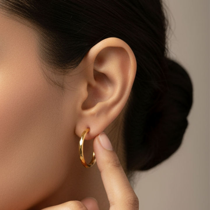 Timeless and refined, the Classic Sheen Hoop showcases a slim gold bali with diamond‑cut faceting that glints softly in natural and office light. Designed for everyday ease, its lightweight profile sits comfortably while adding a polished finish to shirts, saris, and weekend denim alike. Understated yet elevated, it’s the reliable hoop that keeps your look impeccably put‑together from morning to evening.